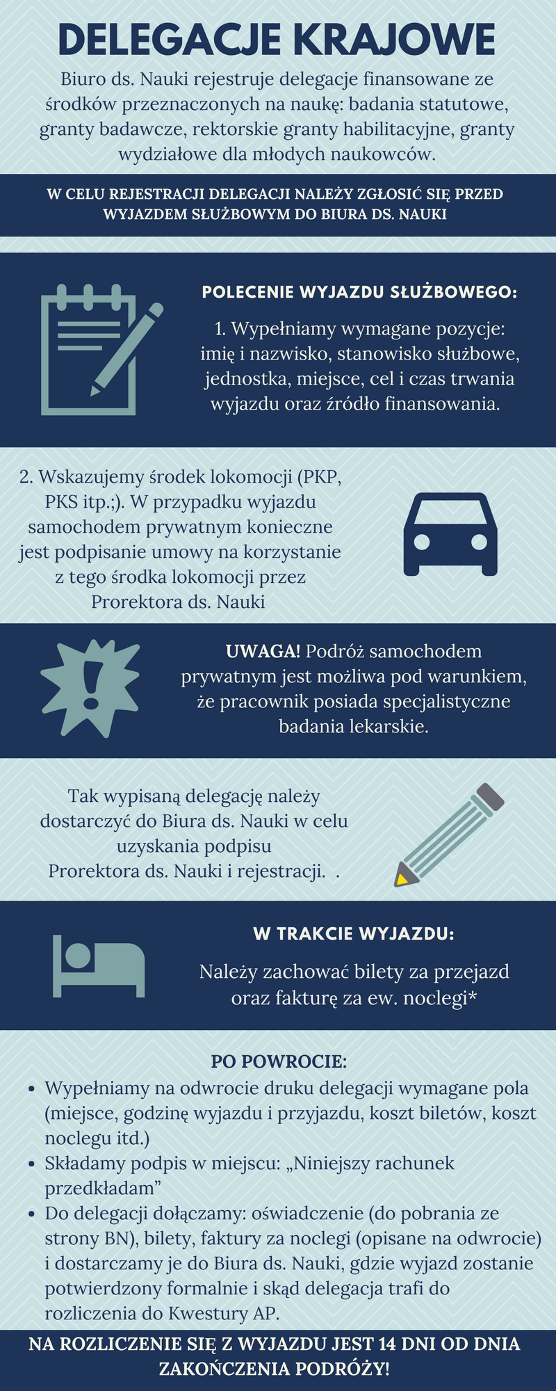 Rejestracją i rozliczaniem delegacji krajowych pracowników dydaktycznych i badawczo-dydaktycznych zajmują się poszczególne jednostki dydaktyczne.